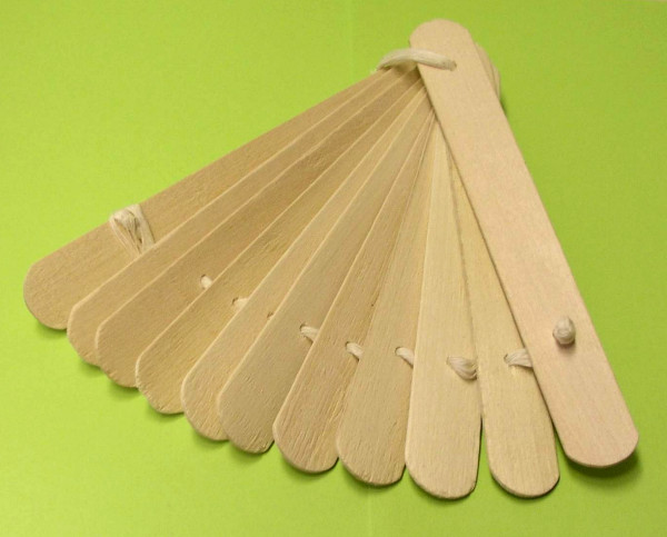 Legyezőhöz fúrjunk át legalább 12 db spatulát mindkét végén és az egyik felén kössük össze jó szorosra, a másik felén lazán fűzzük fel. Sokkal mutatósabb lesz, ha legalább 30 darabból készítjük és mintákat is festünk az egyes lapokra.