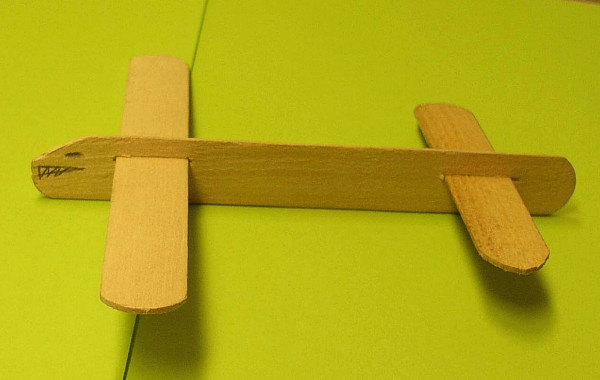 A másik repülő elkészítése is egyszerű, először összeragasztjuk a két-két lapot a szárnyhoz, aztán a testre ragasztjuk a szárnyat és a farkat, majd egy rövidebbre vágott spatula ráragasztásával stabilabbá tehetjük.