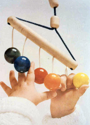 A rudat fűrészeljük fel a rajzon feltüntetett hosszokra, melyek méretei milliméterben vannak feltüntetve, 1:2 méretarányban. Jelöljük be a rúdon a furatok helyét és fogjuk satuba, majd fúrjuk át, utána a zsinór csomójának szélesítsük ki a furatot a rajz szerint. Ez után csiszoljuk át az alkatrészeket, és fessük be a kívánt színűre. Ha megszáradt fűzzük át a golyókon és a rúdon a 15 cm hosszú zsinórokat és kössünk mindkét végére csomót. Húzzuk meg egy kicsit, hogy a csomó a fúrat kiszélesített mélyedésébe feküdjön. Most a vastagabb zsinórt fűzzük át az összekötőkön és a rúd két végén, kössünk csomót rá, hogy felakasztható legyen.