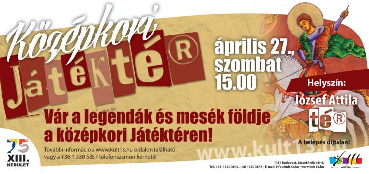 A hat alkalomból álló Játéktér rendezvénysorozat első állomása a középkor hangulatát idézi középkori interaktív játszóházzal, vetélkedőkkel, mesemondással és kézműves foglalkozásokkal. A rendezvényre családokat, kicsiket és nagyokat várnak Budapesten, az Angyalföldi József Attila Művelődési Központ előtti térre.