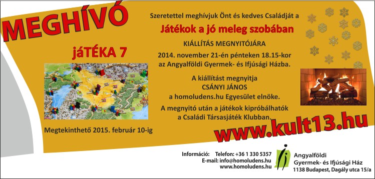 A homoludens.hu Egyesület által létrehozott jáTÉKA kamara kiállítás sorozat 7. tagja a családi, táblás társasjátékokat helyezi a középpontba. Az egyik tárlóban felnőttek vagy nagyobb gyerekek játékaiból adunk válogatást, a másik tárolóban pedig 5-6 éves gyerekek és szüleik együttjátszására lehetőséget adókat. Ezekhez a játékokhoz le kell ülni a nappali asztalhoz a kényelmes fotelekbe, meleg teát bekészíteni mindenkinek és elmélyülni a kártyalapok, játékpénzek, áruk gyűjtésében, vagy csapatban, közösen küzdeni a sárkányok és más gonosz lények ellen.