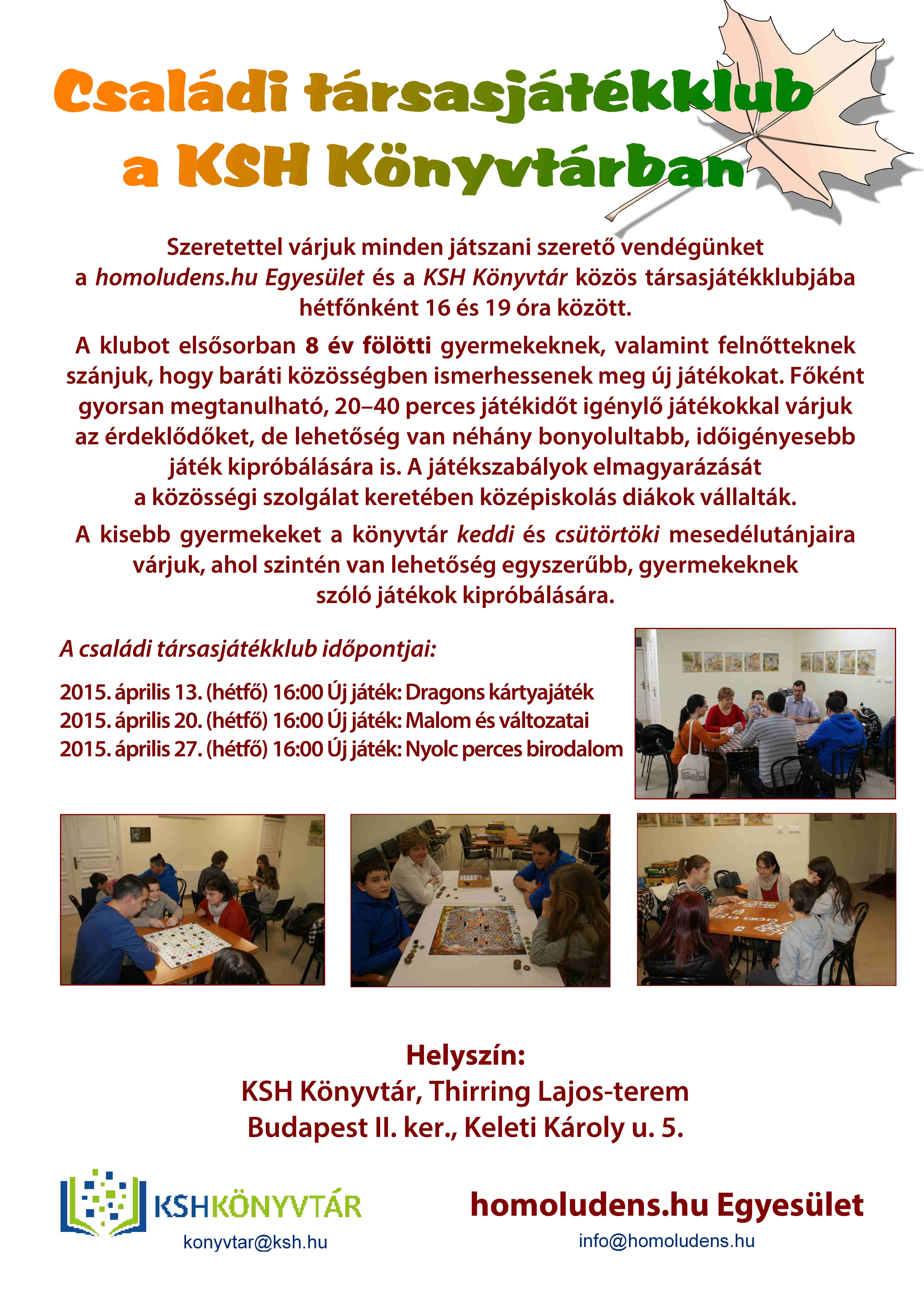 A homoludens.hu Egyesülettel együttműködve 2014 novemberében indította el a könyvtár a családi társasjátékklubot felnőttek és 8 évesnél idősebb gyerekek számára. A klub célja, hogy az érdeklődők baráti környezetben próbálhassanak ki új, egyszerűen elsajátítható társasjátékokat.
