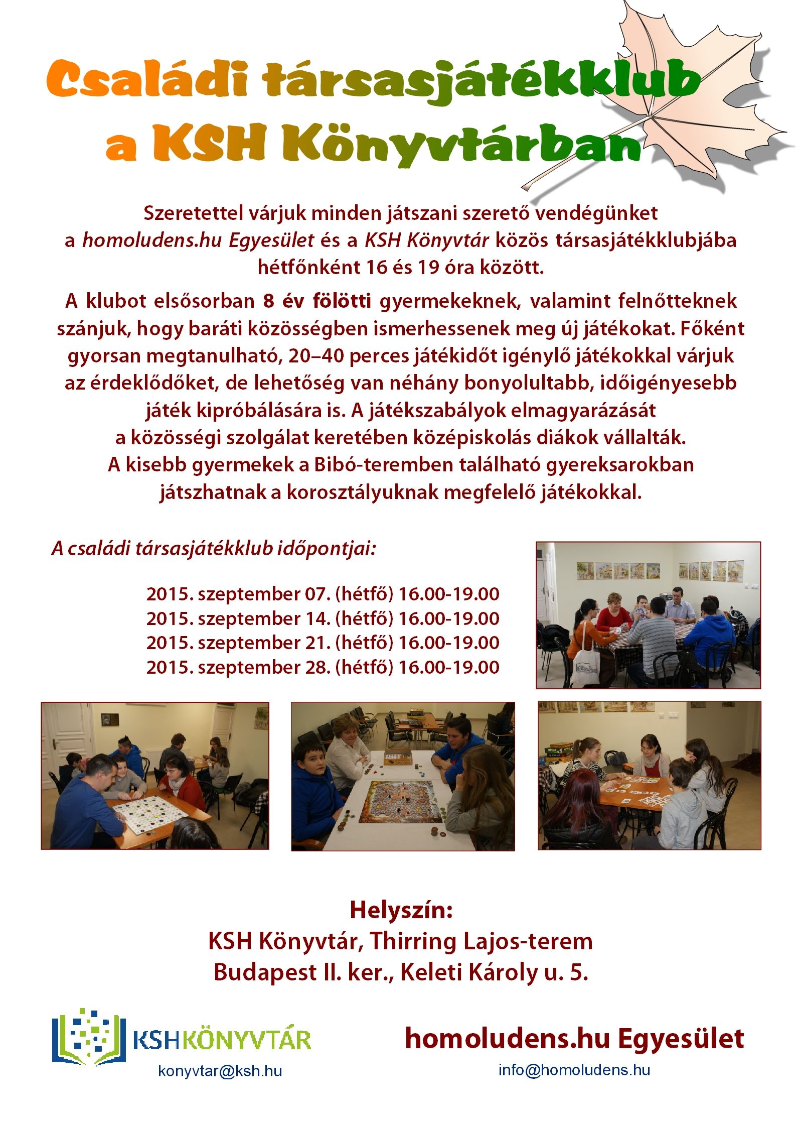 A homoludens.hu Egyesülettel együttműködve 2014 novemberében indította el a könyvtár a családi társasjátékklubot felnőttek és 8 évesnél idősebb gyerekek számára. A klub célja, hogy az érdeklődők baráti környezetben próbálhassanak ki új, egyszerűen elsajátítható társasjátékokat.