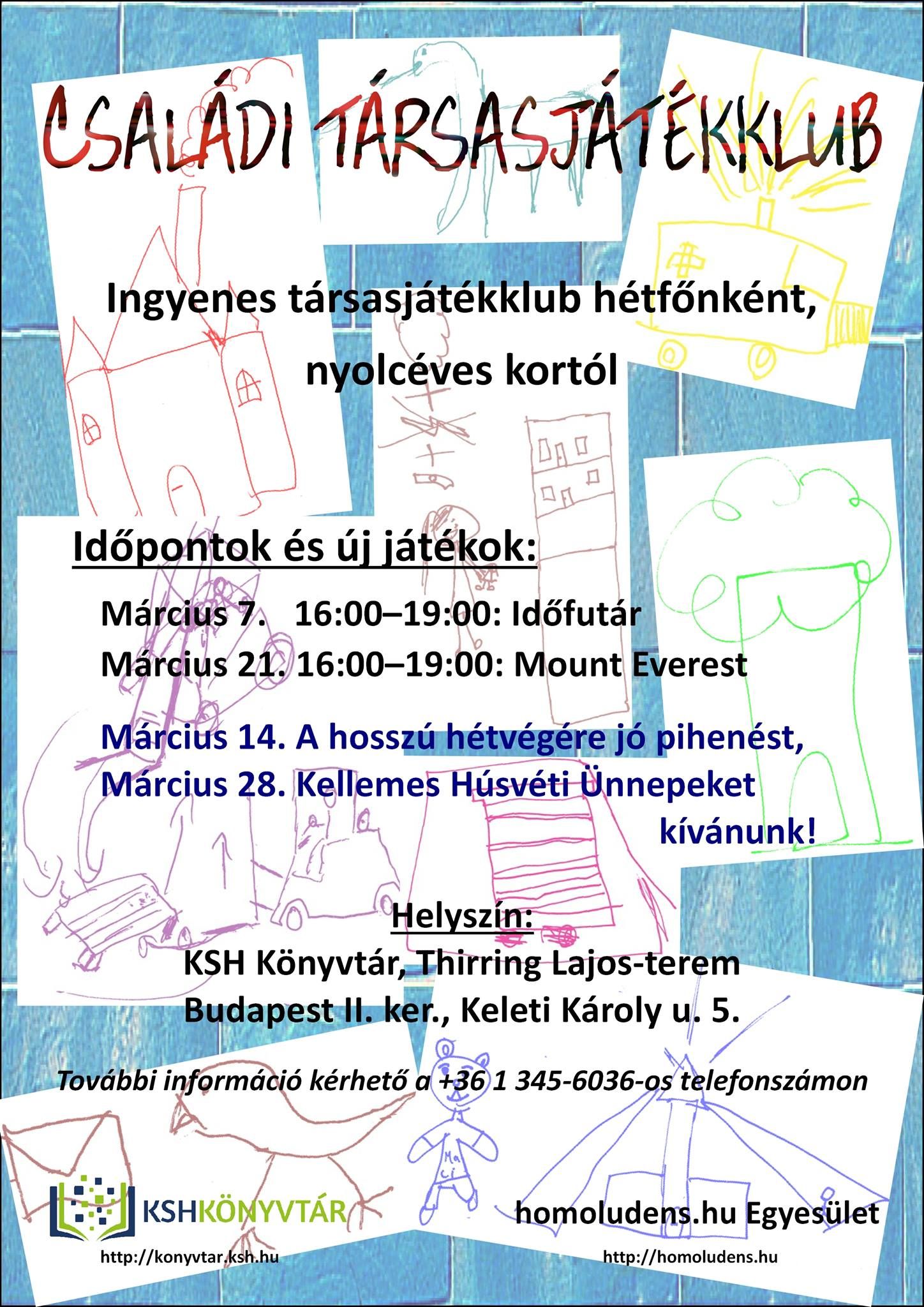 A homoludens.hu Egyesülettel együttműködve 2014 novemberében indította el a könyvtár a családi társasjátékklubot felnőttek és 8 évesnél idősebb gyerekek számára. A klub célja, hogy az érdeklődők baráti környezetben próbálhassanak ki új, egyszerűen elsajátítható társasjátékokat.