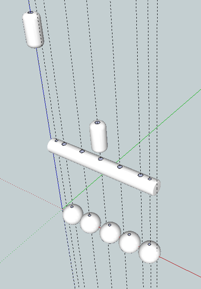 A rudat fűrészeljük a feltüntetett hosszra (1 tétel). Jelöljük be rajta a furatok helyét, majd satuba fogva fúrjuk át. A zsinór csomójának szélesítsük ki a furatot a rajz szerint, 2 mm-rel nagyobb átmérőjű furat fúrásával. A golyókat is fogjuk satuba, fúrjuk át őket, és süllyesszük ki a furat egyik végét az előbbiek szerint. Készítsük el az összefogókat is (2 tétel). Ezután csiszoljuk át a darabokat, és fessük be a kívánt színűre. Miután a rúd és a golyók megszáradtak, fűzzük át rajtuk a 15 cm hosszú zsinórokat, és kössünk mindkét végükre csomót. Húzzuk meg egy kissé a zsinórokat, hogy a csomók a furatok besüllyesztett mélyedéseiben feküdjenek. Fűzzük át a vastagabb zsinórt az összekötőn és a rúd két végén, kössünk rá csomót, majd függesszük fel.