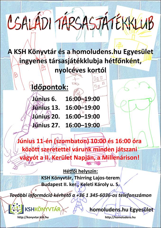 A homoludens.hu Egyesülettel együttműködve 2014 novemberében indította el a könyvtár a családi társasjátékklubot felnőttek és 8 évesnél idősebb gyerekek számára. A klub célja, hogy az érdeklődők baráti környezetben próbálhassanak ki új, egyszerűen elsajátítható társasjátékokat.