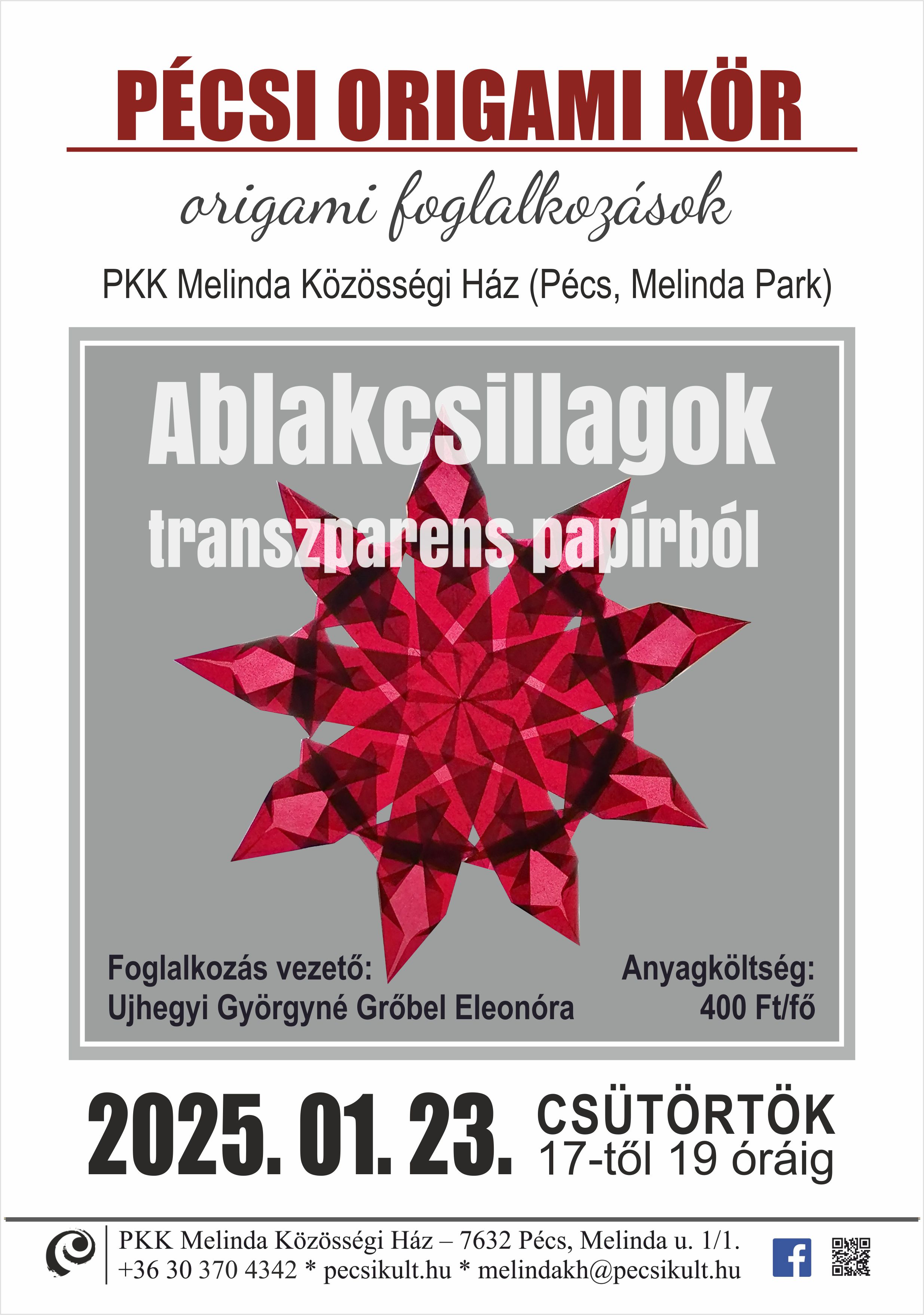 Csütörtökön Ujhegyi Györgyné Grőbel Nóra jön hozzánk hajtogatni és vele készítünk néhány ablakcsillagot. A foglalkozás anyagköltsége 400 FT/fő.