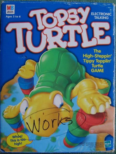 A Topsy Turtle egy kiváló társasjáték, 2 - 4 játékos részére, az átlagos játékidő rövid, csak 10 perc. A társas elsősorban gyerekeknek készült, akár már 3 éves kortól is játszható. A játékmenet erősen épít a szimuláció mechanizmusra.
